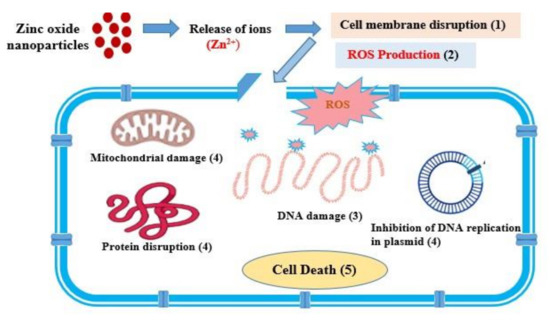 According to Mahamuni et al. [63], the antimicrobial activity of the ZnO-NPs is due to the release of zinc ions (Zn+) in aerobic conditions, which shows toxicity to the microorganism. The released Zn+ ions bind to the cell wall and result in disruption of the cell membrane to the production of reactive oxygen species (ROS), including hydrogen peroxide (H2O2) [63,64]. The generation of hydrogen peroxide is the main factor behind the antimicrobial property. The membrane lipid peroxidation damages the DNA of the cell and also inhibits the plasmid DNA replication. The revealed hydrogen peroxides also disrupt protein structure and reducing sugars, and therefore reduce overall cell viability [65,66,67]. The probable mechanism of antimicrobial activity of ZnO-NPs is presented in Figure 11.