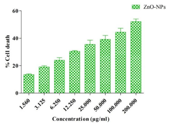 To evaluate the anticancer effect through MTT assay, the method reported by Kumari et al. [34] was used. The lung cancer cells (A549) at a density of 1 × 104 cells/mL were seeded in a 96-well plate and incubated at 37 °C for 24 h under 5% CO2. The next day, cancer cells were treated with different concentrations (1.56–200 μg/mL) of ZnO-NPs for 24 h, followed by an MTT assay (4 h incubation) to assess the cell viability. For positive and negative control, Paclitaxel and DMSO were used, respectively. After 4 h, DMSO (100 μL) was added to each well for dissolving the purple-colored complex. Using a microplate reader, the optical density was noted at 595 nm. IC50 values of the ZnO-NPs (in triplicate) were further recorded, and cell viability was analyzed using the following formula: