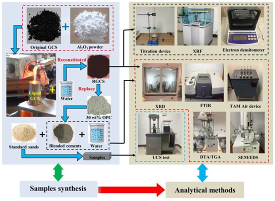 The original GCS, produced by melting, water quenching, granulation, drying, and ball milling, was obtained from a copper smelter. The modifying reagent was analytical pure reagent Al2O3, provided by Jiangxi Hengsheng New Material Co., Ltd in Jian, Jiangxi, China. Byggcement (CEM II/A-LL 42.5 R), was used as OPC for a control group, which was provided by a cement plant in Changsha, Hunan, China.