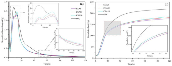 The normalized heat flow curves (Figure 3a) and cumulative heat flow curves (Figure 3b) of OPC, CSA0, CSA05, and CSA10, as measured by isothermal calorimetry, are obtained. The characteristic values of heat flow and cumulative heat of the four samples are summarized in Table 2. In Figure 3a, the first heat flow peak was generated within a few minutes after the OPC or blended cement was mixed with water (the initial period (I)), which was derived from the exothermic hydration of C3S [34]. After a short exothermic period, the sample entered the induction period (II), the duration of which depended primarily on the lattice defects of C3S and was about 7 h–8 h. The early hydration of C3S generally occurred at the activation point where it was most likely to react with water, also known as a lattice defect [35]. The early hydration reaction induced Ca2+ on the surface of C3S to be incorporated into the aqueous solution, forming a negatively charged “silicon rich layer”. Then, the “silicon-rich layer” absorbed Ca2+ from the aqueous solution, forming “electric double layers” that prevented further hydrolysis of C3S. The electric potential difference (ξ potential) between the “electric double layers” gradually decreased due to the release of Ca2+ by the slow hydrolysis of C3S. After the electric potential difference was decreased to the point where it was unlikely to resist the coulombic forces between the ions, the acceleration period (III) began with the precipitation of Ca(OH)2 crystals and a small amount of C-S-H on the surface of C3S. This coincided with the second heat flow peak at about 8 h for OPC and blended cement paste samples. Compared to OPC, since RGCS replaced part of the OPC in the blended cements and produced a dilution effect, the second heat flow peak of the blended cements was significantly lower and slightly delayed. On the other hand, the second heat flow peak of CSA10 not only appeared earlier than the other blended cements, but also had higher values. This indicated that the Ca2+ dissociation on the C3S surface was significantly inhibited by RGCS, which limited the early exothermic hydration of C3S, but was effectively alleviated by the incorporation of Al2O3.