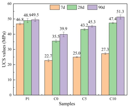 Given in Figure 4, the UCS values of C0, C5, and C10 (22.7, 25.0, and 27.3 MPa, respectively) reached only about 50% of the P1 UCS value (46.8 MPa) by the early stage of consolidation (7 d). This indicated that, in the early stage of the consolidation of blended cement mortars, the cement hydration reaction was dominant, and the pozzolanic reaction was not prominent. Further, the specific surface area of RGCS was larger than that of OPC [36], which made the finer RGCS particles encapsulate OPC particles, resulting in the insufficient diffusion exchange rate of cement particles and thus inhibiting the hydration reaction in the early stage. The UCS values of C5 and C10 were 10.1% and 20.3% higher, respectively, than C0, which indicated that increasing the content of Al2O3 in RGCS could effectively alleviate the lag in the early strength development of blended cement mortar.
