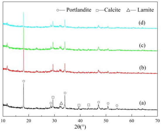 XRD patterns of the pastes prepared using OPC and blended cements cured for 28 d are presented in Figure 5. Additionally, it shows that the samples had similar diffraction peaks at the same position. The main hydrated crystalline minerals of the samples were portlandite (CH), calcite (CaCO3), and larnite (β-C2S). Notably, it was difficult to detect C-S-H gel using XRD because of its amorphous structure. Of these minerals, the diffraction peak intensity of CH was the highest, indicating that it accounted for the most among the hydration products. The existence of CaCO3 was mainly due to the oxidation of cement itself, and some proportion of CH was carbonized by CO2 during curing [37]. Additionally, the existence of β-C2S was mainly due to its slow hydration rate. Some observations [38] have found the surface of β-C2S to still be covered with only a small quantity of amorphous hydrated calcium silicate after tens of days. In addition, the modification effect of Al2O3 on RGCS can be intuitively judged by the CH consumption, since the formation of CH was accompanied by the whole hydration process of cement. The research [39] has showed that CH not only had the positive impact of providing an alkaline environment for the hydration reaction, but also had the negative effect of increasing the pore ratio and reducing the later strength of cement or blended cement.