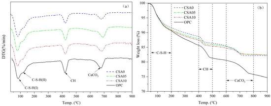 The DTA/TGA curves of OPC and blended cement samples are shown in Figure 6. From the DTA curves, the first endothermic peak between 80 °C and 200 °C resulted from the separation of the C-S-H interlayer water [40]. Additionally, a weak signal on the right shoulder of the first peak (at about 130 °C) was consistent with the hypothesis proposed by Taylor [41], indicating the presence of two different structures of C-S-H. One was the tobermorite-type structure, or C-S-H (I). The other was the jennite-type structure with higher Ca/Si ratio, denoted C-S-H (II). Given in the TGA curves (Figure 6b), the addition of 30 wt% RGCS to the blended cement reduced the peak strength of C-S-H in CSA0 sample. Additionally, the consumption of CH in pozzolanic reaction accelerated the transformation of the C-S-H gel structure from C-S-H (I) to C-S-H (II). The improvement might benefit from the additional release of Ca2+ due to the decrease in OH− by pozzolanic reaction, so that the improvement effect became increasingly obvious with the increase in Al2O3 in the RGCS. Regarding the quantity and structure of C-S-H gel, it is worth considering in the discussion that the largest amounts of C-S-H and C-S-H (II) are generated in the CSA10 sample.
