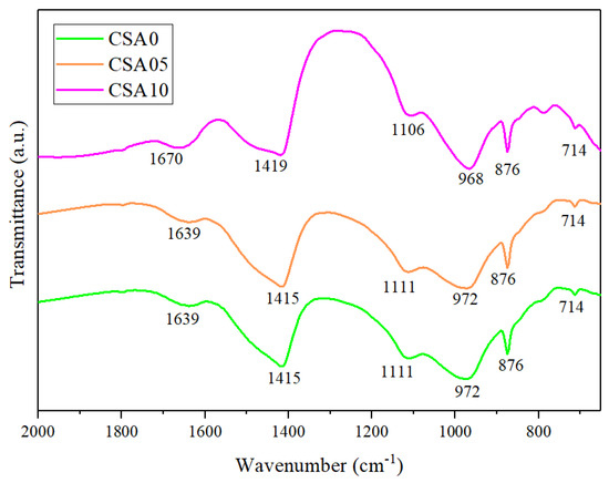 Figure 7 shows the FTIR spectra for the blended cement pastes at curing ages of 28 days, and the similarities in FTIR spectra confirm a similar kind of reaction product formation for blended cement pastes. The bands near 1419 and 1415 are assigned to the asymmetric stretching vibration of C-O bonds of calcite [46]. The available peaks at 876 and 714 cm−1 are due to the bending vibration of C-O bonds in CO32− [47], which is attributed to the carbonation of CH by the pozzolanic reaction and the environment. The intensity of these peaks increases slightly with the addition of Al2O3, indicating a higher consumption of CH, resulting in a higher degrees of pozzolanic reaction. The absorption peaks at 1639 and 1670 cm−1 correspond to the bending vibration of the fundamental O-H bond in the water [48]. The peak at about 1111 cm−1 is due to the asymmetric stretching vibration of S-O bonds of SO42− groups in ettringite (Aft) [47], which has a small shift towards lower wavenumber and slightly deeper peak in CSA10 sample for providing more aluminates. The peaks at 972 and 968 cm−1 are due to the asymmetric stretching vibration of Si-O-Si or Si-O-Al bands in the SiO4 tetrahedron [49] The more intense peak can be observed for more C-S-H or C-A-S-H gel being produced with the addition of Al2O3 in RGCS. Additionally, the lower wavenumber is mainly due to the increase in Al/Si and Ca/Si ratios, resulting in two C-S-H structural differences. The FTIR results have verified our DTG/TGA measurements in Section 3.6, so that with the addition of Al2O3 in RGCS, the generation of C-S-H gels is promoted by accelerating the consumption of CH, while a higher proportion of Al facilitates the transformation of C-S-H (I) to C-S-H (II).