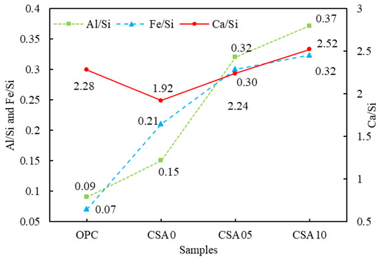 For further analysis of the differences in C-S-H gel compositions of OPC and blended cement samples, semi-quantitative analysis of Ca/Si, Al/Si, and Fe/Si ratios in EDS was conducted using the random average method. The results, displayed in Figure 9, showed that the Ca/Si ratios of CSA0 (1.92) and CSA05 (2.24) samples were lower than that of OPC (2.28), but the Ca/Si ratio of CSA10 (2.52) was higher than that of OPC. This supports that with the increase in Al2O3 content in RGCS, Al replaces Ca and plays the role of network-changing body to enhance the pozzolanic activity. Then, the dissociated Ca participated in the pozzolanic activity to form a higher Ca/Si ratio C-S-H. Meanwhile, the Al/Si and Fe/Si ratios in blended cement samples were much larger than those in the OPC and were proportional to the content of Al2O3 in the RGCS. The data indicate that RGCS released active components such as Al and Fe during dissociation and formed C-S-H with high Al/Si and Fe/Si ratios by pozzolanic reaction. Notably, the increase in Al2O3 adding in RGCS can effectively promote this process.