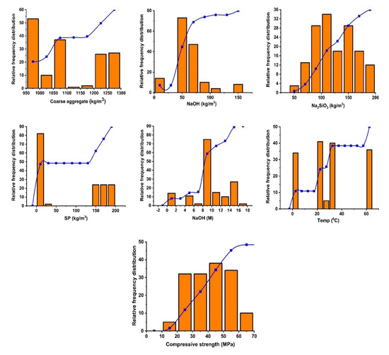 For the representation of the database, the Anaconda-based Python programming (version 3.7) was utilized from the published literature (Table S1) [62,63,64,65,66,67,68,69,70,71,72]. The data were gathered from the accessible literature and comprise nine parameters, namely as fly ash (kg/m3), alkaline activator (kg/m3), aggregate (kg/m3), GGBS (kg/m3), NaOH molarity, SP dosage (kg/m3), curing temperature (°C) and an output parameter of compressive strength as illustrated in Figure 1. Every parameter that was chosen had a significant impact on the strength qualities of fly-ash-slag-based concrete. Moreover, the Python programming language was used to find the link between these variables and concrete compressive strength. Additionally, the influential variables in forecasting the mechanical strength were evaluated through the use of permutation features. Furthermore, Table 2 illustrates the variable range values with maxima and minima based on the 156 data points, while Table 3 displays the results of the statistical-analysis check, which includes the mean, the count, and the standard deviation. The parameters used in making the models have a substantial influence on the model’s robustness. Seaborn, a command in Python, is used to employ machine learning (ML) and to depict the correlation between two variables.
