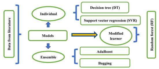 ML technologies are now being used in a wide range of industries to anticipate and understand the nature of various constituents. In this study, ML-based methods such as SVM, the decision tree (DT), RF, and multiple linear regressions (MLR), were utilized to estimate the compressive strength of GPC. These methods were chosen for their popularity, robustness in predicting outcomes, and were recognized as the top evaluated algorithms. Furthermore, the ensemble model with weak learners was utilized to model the strength of GPC utilizing AdaBoost and bagging. Moreover, Figure 2 depicts the entire systematic diagram of the individual and ensemble learning approach.