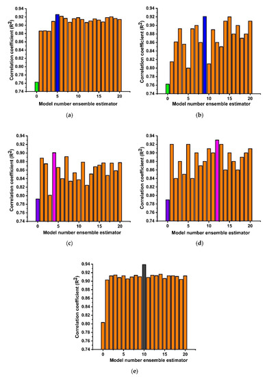 There are two types of tuning parameters utilized in communal (ensemble) algorithms: (i) parameters that are connected with the perfect amount of model learners, and (ii) learning rates. The boosting and bagging algorithms with twenty ensemble models were made from the individual base learner and the best model constructs were picked based on strong correlation coefficient values, as shown in Figure 3 and Table 4. It can be seen that the DT with AdaBoost and bagging with N = 5 and 9 yields an R2 of 0.92. Moreover, support vector regression (SVR) shows a similar trend with an estimator of 4 and 12 yielding a strong correlation of about 0.90 and 0.93, respectively.