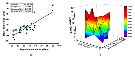 A linear regression model for predicting GPC with variable influences is illustrated in Figure 4. It should be noted that the Python-based approach has a strong correlation in the prediction of strength, as demonstrated in Figure 4a. However, this approach shows a lesser correlation in prediction with R2 = 0.637. In addition, the difference between the prediction and target in terms of its absolute-error distribution is illustrated in Figure 4b, showing that the majority of the predicted outcomes depict greater error with 17.87 MPa (maximum), 0.29 MPa (minimum), and 7.69 MPa (average) absolute error, specifying that the data set of the model is biased. It shows that linear regression may be used to anticipate non-linear analysis results to a limited extent. Although, the MLR model cannot be used for non-linear analysis outcomes that have the strongest correlation to their outcome.