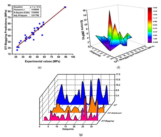 The supervised and nonlinear regression model with a DT provided a soundly favorable prediction outcome, as depicted in Figure 5. In addition, the DT was modeled using several ensemble methods, such as bagging and boosting, as depicted in Figure 5. It can be seen in Figure 5a that the DT as an individual algorithm produces a good relationship with R2 = 0.76. Moreover, the performance of the model can also be assessed by its absolute error, as demonstrated in Figure 5b. However, the model accuracy and outcome prediction can also be evolved by using ensemble approaches due to its performances and robustness. In addition, adding a boosting regressor to the weak or individual learner shows a positive correlation with R2 = 0.92, as depicted in Figure 5c, with its reduced error distribution in Figure 5d. The bagging model illustrates a good R2 = 0.92 with average errors of 15.78 MPa (lesser maximum), 0.26 MPa (minimum), and 3.22 MPa compared to MLR, as shown in Figure 5e,f. Although, the same individual model was modeled with AdaBoost regressor, showing a clear significant enhancement of the model. Moreover, the efficiency of the model can also be judged by its absolute errors, as depicted in Figure 5g. Its shows that the model performance is significantly enhanced as compared to the MLR model.