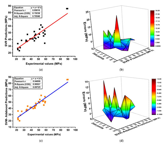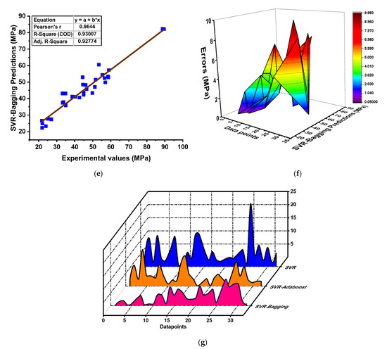ML with SVR was carried out to predict the mechanical properties of GPC, as shown in Figure 6. The predicted outcome with experimental data points as individual regression models depicts a strong relationship with R2= 0.79 due to its obstinate generalization capacity in making a robust performance, as shown in Figure 6a. Similarly, to the DT, SVR model accuracy can also be evaluated by its absolute-error distributions, as depicted in Figure 6b. It shows that the overall results of the predicted outcome lie close to the experimental values with minor data lying as outliers, but it does not devalue the accuracy of the model. In addition, in terms of statistical measures, SVM models show reduced average errors of about 5.69 MPa as compared to MLR (7.69 MPa). Likewise, the SVM model is ensembled and thus shows significant enhancements as depicted in Figure 6c,e with R2 = 0.90 and R2 = 0.93, respectively. Figure 6c,d represent the regression analysis of the boosting algorithm with its error distribution, showing that the boosting algorithm has an obstinate effect on forecasting the properties of concrete. Overall, the efficiency of the model can also be evaluated by its maximum (13.97 MPa), minimum (0.19 MPa), and average errors (4.14 MPa), and it is reported as a minimum compared to MLR. In addition, the bagging algorithm shows a similar trend by yielding a reasonable model with R2= 0.93 and its error distribution of 9.92 MPa (maximum), 0.08 MPa (minimum), and 3.76 MPa (average), as illustrated in Figure 6e,f. The overall comparison between SVR and bagging and boosting in terms of their absolute errors is shown in Figure 6g. The model with SVR demonstrates a significant and accurate prediction due to the strong learner in the model.