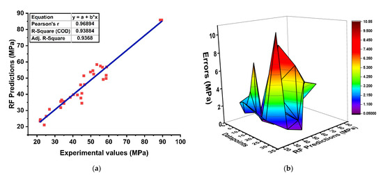 The RF algorithm is a type of ensemble ML approach that incorporates the bagging method and random-feature-selection procedure to yield a predictive model. The predictive performance between the target and experimental results is depicted in Figure 7. The model illustrates a well-defined correlation with R2= 0.938 and is also assessed by its absolute error distributions as illustrated in Figure 7b. It can be seen that the RF-based model gives a lesser difference between prediction and experimental values with maximum, minimum, and average errors of about 10.54 MPa, 0.08 MPa and 3.217 MPa, respectively. Similarly, the forecasted results show that the influence of the strong learner in prediction is far better than individual approaches.