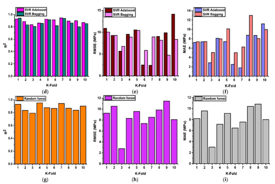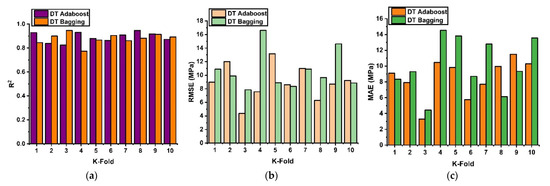 It uses nine out of ten subsets to design the robust learner and one set to authenticate the model. This approach yields an average error accuracy and is evaluated through statistical errors. The ten-fold cross-validation approach is said to demonstrate the generalization and dependability of the model performance, as demonstrated in Figure 8. The DT model with the ensemble approach via AdaBoost and bagging depicts good ten-fold R2 values with an average values of R2 = 0.89 and 0.879 for the AdaBoost and bagging approaches, as illustrated in Figure 8a. Similarly, the model shows a significant validation response by showing lesser RMSE and MAE errors with 8.99 MPa and 10.65 MPa for both ensemble models, respectively, as shown in Figure 8b,c. Moreover, the validation response via the SVR model in terms of R2 shows an average error of 0.89 and 0.86 for the tenth k series for both models, as illustrated in Figure 8d. This depicts a strong accuracy of the models towards predictions. Likewise, the validation response in term of RMSE and MAE for the SVR model demonstrate the same response as for DT by showing lesser errors, as illustrated in Figure 8e,f. Additionally, the RF model depicts a comparable response to DT and SVR by adamantly representing a positive R2 relation with predicted values and showing lesser errors.