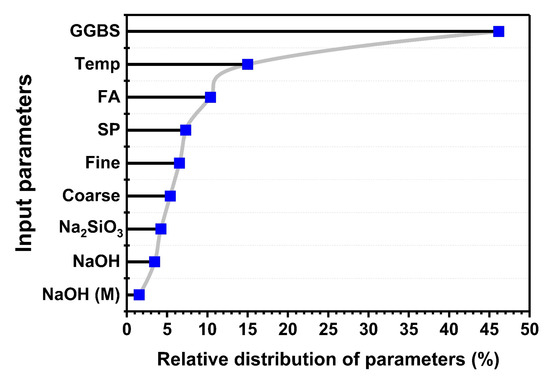 The permutation analysis depicts the influence of each variable on the target strength of GPC, and was conducted through the spyder notebook by using Python language in Anaconda software, as illustrated in Figure 9. The analysis results reveal that the GGBS, FA, and temperature (°C) have a significant effect on the strength of GPC due to the occurrence of major SiO2, Al2O3, and CaO in the amorphous state [73,74,75]. Additionally, the presence of GGBS in concrete gives rise to binding phenomena in the presence of the alkaline medium. Moreover, when GGBS is combined with FA in an alkaline medium, it gives rise to additional calcium content that is responsible for the enhanced mechanical properties.
