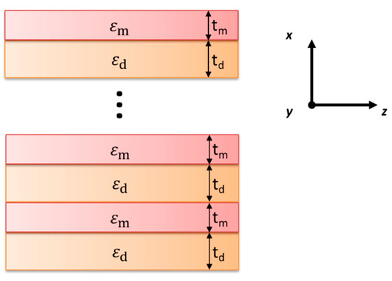 where , , as well as , are, respectively, relative permittivity and thickness of plasmonic and dielectric layers constituting the structure. It is worth noting that this approximation is valid if local condition is fulfilled, i.e., the dimensions of the unit cell are subwavelength, i.e., , where is wavelength of considered radiation.