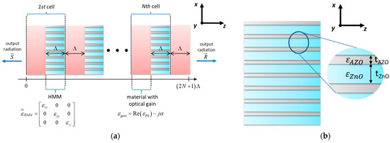In this work, we investigate threshold laser action in a DFB laser based on photonic hypercrystal (PHC), see Figure 2a. The distributed feedback in the considered structure is realized with periodically arranged layers formed with dielectric material with optical gain and hyperbolic medium (HMM structure), see Figure 2b. In this case, polystyrene polymer (PS) has been chosen as an example of gain dielectric medium with complex permittivity , where correspond to gain of the medium [41]. To obtain optical gain in such a medium, doping with various dye molecules, e.g., rhodamine or DCM, may be performed [42,43]. On the other hand, we consider the HMM medium to be formed with subsequent layers of zinc oxide (ZnO) and zinc oxide with 2.08% concentration of aluminum (AZO), which can be described with well-established dielectric functions [44,45]. To determine influence of the spatial dispersion on generation properties in such laser, the HMM structure is described with the use of local, i.e., , see Equations (1) and (2), and nonlocal effective medium approximations, i.e., , see Equations (7) and (9).