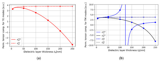 Real parts of local and nonlocal permittivity tensor components for TE- (a) and TM-polarized waves (b) as a function of dielectric thickness. The cases selected for analysis, i.e., = 5 (case 1), 50 (case 2), 100 (case 3), 150 (case 4), 200 (case 5), 250 nm (case 6) have been denoted with dots for nonlocal curves and x-marks for local curves.