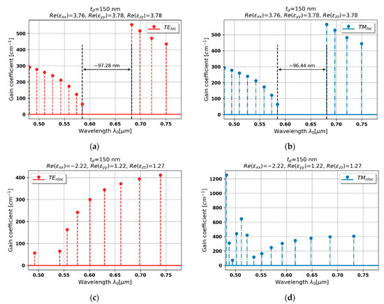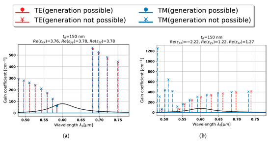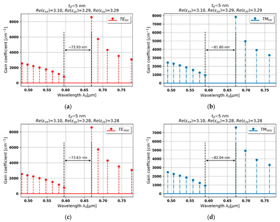 where is Fresnel transmission amplitude coefficient for the gain medium-air interfaces. Finding the roots of Equation (18) allows us to determine modal spectra illustrating gain thresholds, i.e., the amount of gain that is required to obtain generation, for TE and TM longitudinal modes of a DFB laser based on photonic hypercrystal. It is worth underlining that, by application of proper boundary conditions, we consider only normal far-field modes of the DFB laser, i.e., waves propagating along axis with wavevector .