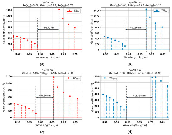 Increasing the dielectric thickness leads to violation of the local condition, which consequently leads to stronger spatial dispersion and influences generation properties of the considered laser. In the case of HMM structure based on 50 nm dielectric thickness, the dielectric dispersion for both light polarization is preserved, see Figure 3a,b. However, due to lower permittivity, and thus optical density, the stop band for TE-polarized waves, predicted with the help of nonlocal approach (further referred as nonlocal generation spectrum), is narrower and blueshifted with respect to the generation spectrum based on local EMT description (further referred as local generation spectrum), compare Figure 5a and Figure 5c. Moreover, the gain thresholds predicted with the nonlocal approach (further referred as nonlocal gain thresholds) are noticeably lower than their local counterparts, compare Figure 5a,b and Figure 5c,d.