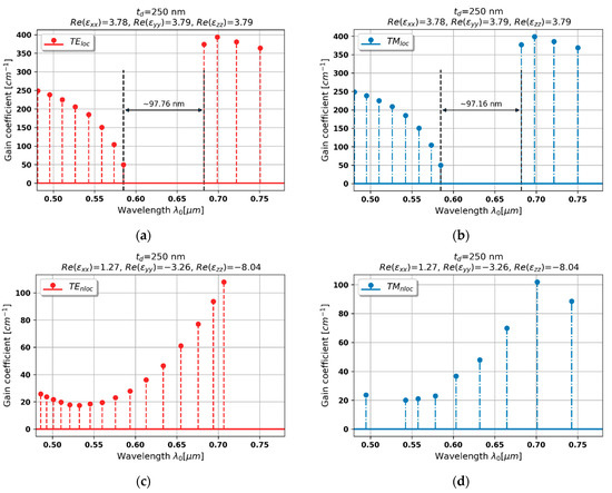 By accounting spatial dispersion in hyperbolic medium based on 200 nm dielectric layer, it is possible to predict the metallic dispersion for TE-polarized waves and epsilon-near-zero for TM polarization, see Figure 3a,b. Due to the dominant contribution of loss/gain coupling in distributed feedback, the Bragg wavelengths for both polarizations are blueshifted, compare Figure 8a,b and Figure 8c,d. On the other hand, the overall level of generation threshold is substantially lowered with respect to behavior predicted with the help of local approximation.