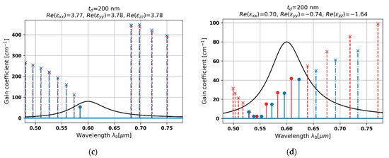 On the other hand, the second case, i.e., = 200 nm, presents significantly diverse behavior, see Figure 10c,d. Instead of single mode generation predicted with the help of local approximation, it is possible to obtain multimode generation for both polarizations. Moreover, since spectra for TE- and TM-polarized waves are shifted in relation to each other, it is possible to obtain simultaneous generation of both polarizations at two distinctively different frequencies (so-called orthogonally polarized beam generation). In this particular case, i.e., for the given PHC structure and gain curve, the most preferred modes are located at 583 and 595 nm for TE and TM polarization, respectively. Thus, the spectral separation between generated modes is 12 nm, which is equivalent to ~10THz and may be considered as useful in many practical applications requiring tunable signal generation, displacement, or force/pressure measurements [52].
