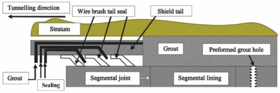 The quality of the shield tail seal has a decisive effect on the effective driving progress of the shield tunnel. The shield tail seal system consists of a steel wire brush, protective plate, and sealing grease, as shown in Figure 1. The sealing grease is pumped to the cavity using a pressure pump in the process of shield driving in the tunnel. Sealing grease is painted on the tunnel walls with the wire brush to form a sealing ring that is used to resist the grouting pressure and keep the slurry and soil out of the shield shell. Once the sealing grease fails, it will cause leakage in the shield tail and ground subsidence or even collapse of the tunnel [2].