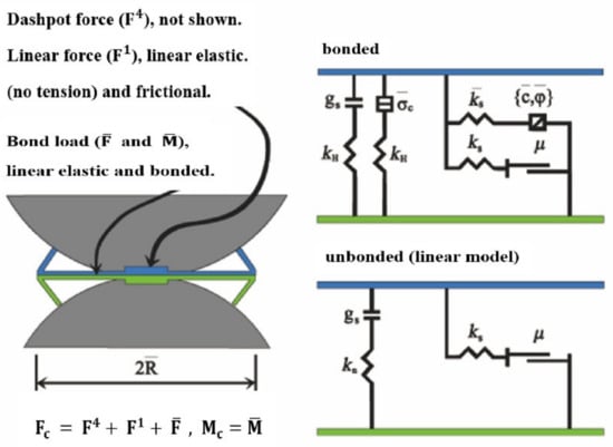In this study, a model was established with Particle Flow Code (PFC), which can simulate the movement and interaction of multiple finite-sized particles [18,19]. The particles were rigid bodies with finite mass that moved independently in terms of translation and rotation. The interaction between the particles is determined by the internal force and moment at the contact interface between the pair-wise particles. The contact mechanical model works based on the particle contact law, in which the internal forces and moments were successively updated. It computes the time evolution of the particle interaction through DEM and derives the explicit dynamic solution to Newton’s laws of motion. The PFC model can mimic synthetic materials constituted with the assembly of rigid grains that interact at the contact interfaces, including both granular and cementitious materials.
