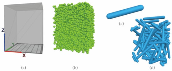 Figure 3. Snapshots of (a) the pressure column and sieve models, (b) powder model, (c) single fiber model, and (d) fiber model used in simulation. - A total of 5533 powder spheres were generated using the “ball distribute” command, with a porosity of 0.6 and a radius of 1 mm (Figure 3b) [25,26,27]. The selected size of the powder spheres was small enough to extrude from the sieve openings, although it cannot be the same size as the actual particles at micron order.