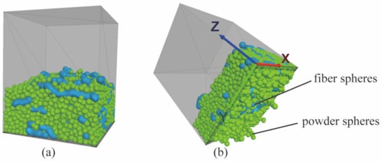 - The model of single fiber was created by a series of spheres with a radius of 1.5 mm and an embedded length of 0.5 mm (Figure 3c) [9]. It looked similar to a pearl necklace where the pearls geometrically interpenetrate with each other. A parallel contact model was adopted between the spheres, which can guarantee that the fiber does not suffer a compressive fracture during compression. The number of spheres for every single fiber depended on the fiber’s aspect ratio, while the fiber concentration determined the number of fibers. A series of fibers with a certain number and random direction were generated in the pressure column using a nested loop structure, as shown in Figure 3d. The physical parameters of the models for the sealing grease simulations are provided in Table 1.