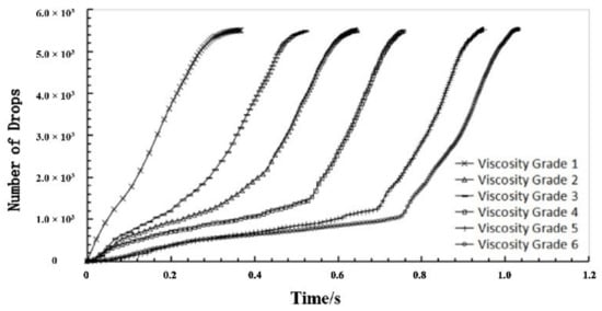 The curves between number of powder spheres squeezed from sieve and time under different viscosity grade.