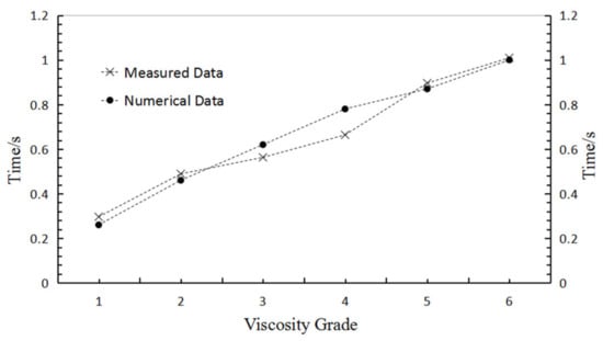 The parameters of a parallel bond model include normal stiffness, friction force, normal critical damping ratio, tangential critical damping ratio, tensile strength, and cohesion. These parameters were adjusted using the variable-controlling approach. Specifically, one of these parameters changed continuously while other parameters remained the same. The viscosity grade of sealing grease would be influenced by this parameter in the condition of extrusion time of sealing grease, with the increase in parameter showing a regular increase. Results showed that only changing the critical damping ratio and tangential critical damping ratio can vary the viscosity of sealing grease. Therefore, the normal and tangential critical damping ratio were increased from 1 × 106 to 3.5 × 106 to adjust the viscosity of simulated grease, with the other parameters remaining constant, as shown in Table 2. The extrusion rate of the sealing grease samples at the six viscosity grades was plotted in Figure 5. When viscosity increases, the extrusion time of the sealing grease gradually increases, which indicates that the extrusion rate of sealing grease slowed down. The experiment measured data, and the numerical simulation data were compared in Figure 6. The measured data and numerical data are basically the same, illustrating a reasonable selection of the parameters for the numerical simulation model.