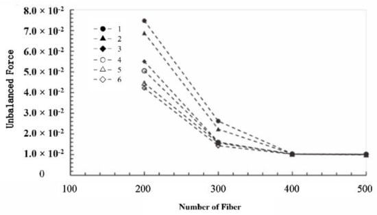 Similarly, the optimum fiber number of the other five viscosity grade was analyzed, which was the same as the fiber number of viscosity grade one. The simulation results of the models at viscosity grades three and five were shown in Figure 7 since the curve patterns of the models at different viscosity grades were consistent. Furthermore, the predicted optimum fiber number was assessed with the unbalanced force at the end of the computation. The unbalanced forces of the model with different fiber numbers and the six viscosity grades were plotted and compared. As shown in Figure 8, the unbalanced forces all decreased as the fiber number increased from 200 to 400 (200, 300, and 400). When the fiber number was higher than 400, the unbalanced force remained constant around 1.02 × 10−2. This indicated that the seal effect and seal state remain unchanged, and thus the fiber number of the model reaching the critical seal state should be around 400. Although the optimum fiber numbers for seal state were similar for different viscosity grades, the unbalanced force decreased with the increase in viscosity grade. This implied that the increase in viscosity could improve the sealing effect without changing the seal state. The higher the viscosity grade, the greater the flow resistance, which is consistent with the experimental results. Fibers build upon the sieve, reducing the flow cross-section of the seal grease. Therefore, an increase in fiber content and viscosity results in an increase in unbalanced forces.