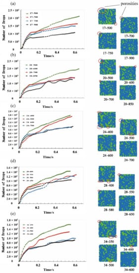 The development of drops number along the simulation and the cross section of the sealing grease models at different fiber’s aspect ratio, including (a) 17, (b) 20, (c) 24, (d) 28 and (e) 34.