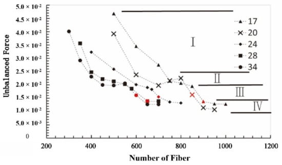 Furthermore, the reasonability of the determined optimum fiber number was assessed by combination with unbalanced force and fiber area proportion. For different aspect ratios of fiber, the variation curve of unbalanced force with the fiber number increasing is shown in Figure 10, in which the red symbol is the optimum fiber number determined hereinbefore. The variation curves can be divided into four stages. For the fiber’s aspect ratio of 34, the unbalanced force gradually decreased to about 0.02, with the fiber number increasing from 260 to 440, which is the first stage. In the second stage, the unbalanced force remained 0.02 until the fiber number increased to 560, which was called the first stabilization period. However, the corresponding cross-section still had several tiny porosities, as shown in Figure 9e. Along with the fiber number increasing from 560 to 620, the unbalanced force decreased, and there was no porosity on the cross-section. It is the third stage, also called the critical seal period. Therefore, the optimum fiber number should be selected in this stage. In the fourth stage, with the increase in fiber number, the unbalanced force was around 0.012 without variation, and there was no gap on the cross-section, which implied that the sealing effect and seal state of the model were the same as in the third stage. Therefore, this stage is called the second stabilization period. Similarly, the other curves also can be divided into four stages, which are the same as fiber’s aspect ratio of 34.