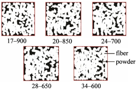 Figure 11 presents a series of cross-sectional images used to analyze the fiber area proportion of “fiber cake” obtained with Image Pro Plus image processing software. Firstly, the entire cross-section surrounded by red lines was regarded as AOI (Area of Interest), and the total cross-sectional area was recorded as A1. Subsequently, the white region in the figure was regarded as AOI, and the corresponding area that is recorded as A2. Therefore, the proportion of the fiber area can be calculated by A2/A1. For each aspect ratio of fiber, the statistical fiber area proportion of “fiber cake” was summarized in Table 4.