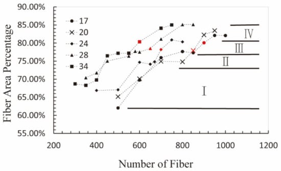 The variation curves of cross-section fiber area percentage with fiber number for different fiber aspect ratio, which can be divided into four stages: I, II (the first stable period), III, IV (the second stable period). The red symbol is the optimum fiber number determined hereinbefore.