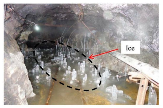 It is also worth mentioning that the low-temperature frozen mining environment in the alpine regions deserves attention. For example, the Alhada lead-zinc mine in Inner Mongolia, China, has a freezing period of up to 7 months every year, where the minimum temperature can reach −38 °C. In winter, the frozen environment of underground stope can be seen by the naked eye (Figure 1). Furthermore, mining areas such as Yukon, Yellowknife, and Nunavut are also located in the cold regions. The mechanical properties of CTB are bound to be affected by the low temperature. However, the majority of studies are carried out to conserve backfill under normal- or higher-temperature curing conditions, and the conclusions may not be applicable to the application of backfill under low-temperature or even frozen conditions. Only a few studies have focused on the mechanical and physical properties of CTB at low and negative temperatures. Jiang [22] studied the rheological and mechanical properties of paste backfill under low-temperature curing conditions and discovered that the yield stress of paste backfill under low-temperature curing conditions reduced first and then subsequently increased, and was significantly lower than that under normal temperature. The strength of frozen CTB is determined by coupling influenced by curing temperature, unfrozen water content, ice content, microstructure, and other factors. The lower the curing temperature is, the higher the ice content and strength of frozen CTB. Mamert [23] investigated the influence of 3% and 5% high-early-age cement on the strength of 80% slag and 20% ordinary cement-mixed CPB in a low-temperature curing environment. The study found that while high-early-age cement was beneficial to the development of CPB strength under low-temperature curing conditions, its hydration reaction was still inhibited by low temperature. UCS is lower than in room-temperature curing conditions. Oreshkin [24] examined the physical and mechanical properties of hollow glass microsphere CTB supplemented with antifreeze at −5 °C, and the results revealed that potassium salt additive and retarder had the best effect on backfilling mortar.
