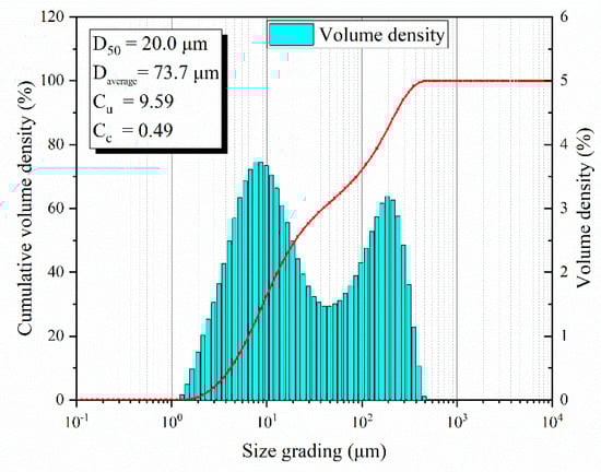 The tailings used in this paper are provided by a mine in Inner Mongolia (a cold region), China, which adopts full tailings-cemented filling with a mass concentration of 73%. After drying and screening, the basic physical properties of the tailings were determined by a series of experiments, as shown in Table 1. The particle-size distribution of the tailings used in the test was evaluated using a Mastersizer 3000 laser particle-size analyzer, and the test results are shown in Figure 2.