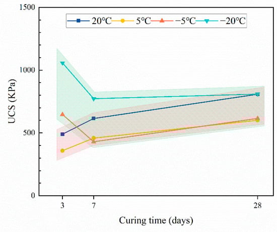 When the curing temperature is positive, the strength of CTB increases gradually with the increase in curing time, and the strength growth rate is faster before 7 days and slows down after 7 days. This is closely linked to the hydration reaction rate of cement. After the preparation of CTB, dicalcium silicate (C2S) and tricalcium silicate (C3S) in the cement clinker is dissolved quickly to generate ettringite (AFt), calcium hydroxide (CH). and calcium silicate hydrate (C-S-H) gel with cementation. The hydration products bind the tailings particles together, while CTB provides strength. The cement-clinker level in CTB is high during the curing process from 3 to 7 days, the hydration response rate is fast, hydration products build quickly, and CTB strength increases rapidly. With the increase in curing time, the cement clinker without hydration reaction of CTB decreases, the hydration reaction rate drops, and the strength growth of CTB slows down [26]. The UCS of CTB is 490.15 Kpa, 614.82 Kpa, and 808.41 KPa at 3 d, 7 d, and 28 d under the curing condition of 20 °C, respectively, and when the curing temperature is reduced to 5 °C, the strength of CTB is 358.06 KPa, 458.76 Kpa, and 601.07 Kpa, respectively, decreasing by 26.95%, 25.38%, and 25.65%. This indicates that the decrease in curing temperature is detrimental to the cement-hydration reaction and low temperatures have an inhibitory effect on the cement-hydration reaction [27]. However, it does not seem to affect the hydration reaction rate of cement, and its strength growth pattern is essentially consistent with that of curing at 20 °C.