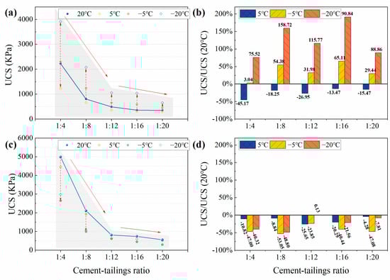 As it is known, the UCS of CTB is closely related to CTR, and Figure 5 reflects the strength development trend of CTB under different curing temperatures as well as the strength change compared with the normal-temperature curing conditions. The experimental results show that regardless of the curing temperatures, the UCS of CTB decreases gradually as the CTR decreases, and the UCS of CTB does not decrease significantly when the CTR is less than 1:12, indicating that the CTR is not the main reason affecting the UCS, as found in relevant studies [28,29]. It should be noted that temperature has a substantial effect on the early and long-term strength of CTB with varied CTR.