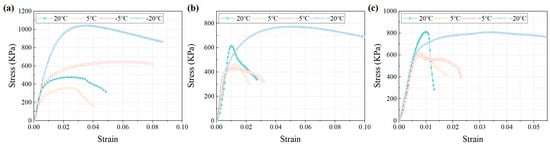 The stress–strain curves show that there is a significant difference between the deformation characteristics of CTB under negative- and positive-temperature curing conditions. The presence of ice makes the deformation characteristics of CTB under negative-temperature curing conditions more complicated. In a negative-temperature environment, liquid water quickly solidifies into solid ice, forming ice cement in CTB. The cohesion of ice cement is proportional to the ice crystal content, which depends on the curing temperature. Therefore, the deformation characteristics of CTB have a high temperature dependence. With the decrease in curing temperature, the deformation characteristics of CTB vary from elastic-plastic to viscoelastic-plastic to strain-hardening to strain-softening.