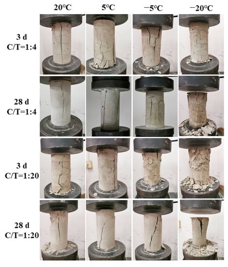 The failure characteristics of CTB must be clarified to guide the filling of underground extraction areas. The previous analysis indicates that temperature has a significant effect on the strength development and deformation characteristics of CTB. The mechanical behavior of CTB differs significantly under positive- and negative-temperature curing conditions, especially in the early curing time. Therefore, CTB specimens with CTR of 1:4 and 1:20 were chosen to observe their early and long-term failure characteristics under different curing temperatures (Figure 7).
