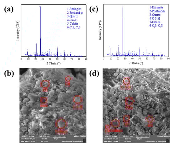 XRD patterns and SEM images of CTB with CTR of 1:12 at curing time of 3 days :(a,b) 20 °C, (c,d) −20 °C.