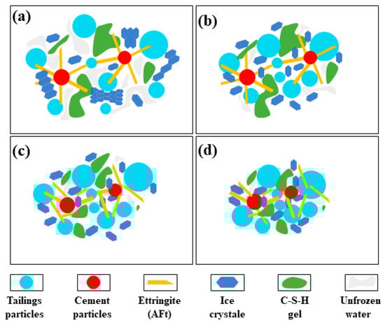 According to the analysis, the failure process of frozen CTB can be separated into four stages, which correspond to (a)–(d) in Figure 9. In the first stage, under the frozen environment, the CTB is a four-phase mixture of solid–liquid–gas and ice, including tailings particles, nonhydrated cement particles, hydration products (mainly AFt and C-S-H gel), solid-phase ice, unfrozen water, and pores (not indicated in Figure 9). At this stage, The CTB skeleton, which is the main source of CTB strength, is formed at this stage by the hydration products, and the cementation ability of the hydration products and the cementation force of the ice work together. In the second stage, there is heterogeneity in the distribution of particles inside CTB, and relatively low-density areas occur locally. Due to the existence of unfrozen water and pores, the compression of the CTB skeleton tends to be compact, and solid particles slip from high-density to low-density areas. When the load exceeds the ultimate strength of the solid-phase ice, the ice body ruptures, the large ice body cracks and slips into small ice bodies, and a portion of the solid-phase ice melts into liquid water under the pressure, which is further dispersed with the assistance of unfrozen water. This is manifested as a high strain in the CTB. In the third stage, with further increase in the load, the pressure induces a small part of the ice body to melt, the solid particles continue to slip to the low-density area, and the CTB skeleton becomes denser. When the load reaches the ultimate strength of the cohesive force of the hydration product gelled, the gelled body fails, manifested by the CTB reaching peak stress and the initiation of microcracks. In the fourth stage, the ice-cementation force and the cohesion of the hydration product colloid are overcome under the action of the load, the solid particles appear reverse slip, tensile stress still needs to overcome the ice cementation force and part of the cohesion of the colloid. The expression is CTB cracks extension, but still has high strength; that is, strain-softening. It is important to note that when the curing time is short, the ultimate strength of the ice’s cementitious body is greater than that of the cement-hydration product’s cementitious body, and the order of occurrence of the second and third stages of the CTB failure process is switched.