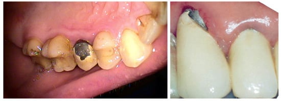 An important area of research when using titanium and cobalt biomaterials from Computer Aided Design and Manufacturing (CAD/CAM) technologies for the supporting structures of crowns and bridges is the determination of their strength parameters [9,10,11,12]. In a stomatognathic system, these structures work in an elastic range and, due to veneering with ceramics, they must have appropriate stiffness. Clinical observations in studies indicate that, in the solutions of fixed dentures manufactured by traditional casting, the veneering ceramics were chipped off the substructure (Figure 1). The detachment of the ceramics most often occurs in the vicinity of the gingival area.