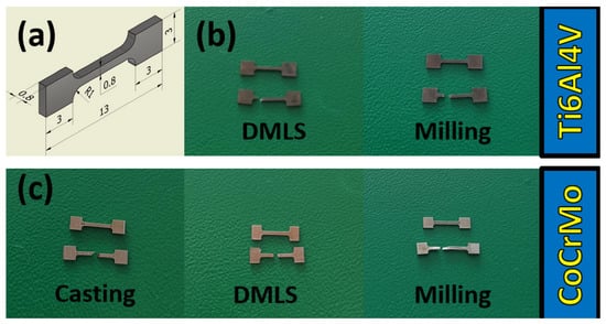 It was necessary to prepare specimens with specific dimensions, in accordance with the standards for tension and compression. The tensile samples had a measuring section with a constant section of 0.8 mm × 0.8 mm and were terminated with heads of increased dimensions (Figure 2). With an appropriate measuring length and a smooth transition to the heads, it can be assumed that the state of deformation and stress at each point of the measuring part is homogeneous. Under such conditions, it is possible to deduce the deformation of the samples and, from the measurements of the total force, the stress generated inside can be calculated. In the axial compressive strength tests, the dimensions of the samples had the shape of cuboids with a height of 3 mm and a square base of 2 mm × 2 mm. For each biomaterial used in the tensile and compression tests, 25 test sets were prepared. For the DMLS, 25 samples of both Ti6Al4V and CoCrMo were prepared, for CAD/CAM milling, 25 samples of both Ti6Al4V and CoCrMo and for the casting, and also 25 samples of CoCrMo.