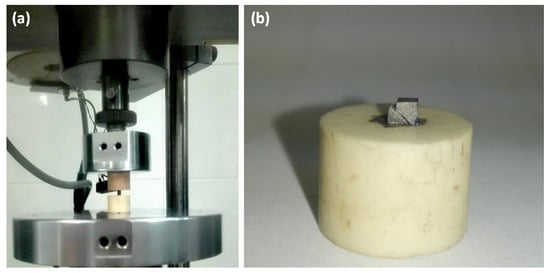 Tensile and compression tests were carried out on an Instron 5566 testing machine, in accordance with the applicable ISO 6892-1:2019 standard [26]. A strain gauge head with a range of up to 10 kN was used and a constant strain rate of Vε = 10−3 s−1 was adopted. Grips were used for stretching, and the tests were carried out in a saline environment at 37 °C. A magnetic stirrer equipped with a heating plate was used, thanks to which a constant temperature was maintained in the entire volume of saline. The bath temperature corresponded to the conditions in the oral cavity. In the tests of materials, the value of the applied forces and the deformation caused by them were recorded, up to the destruction of the samples. Ceramic grips were used to stabilize the samples under compression (Figure 3). During the tests, the samples were compressed axially with a quasi-static load. The value of the applied forces and the deformations caused by them were recorded. The research was carried out to destruction. The compressive stresses σ were determined with the adopted deformation threshold of 15%.