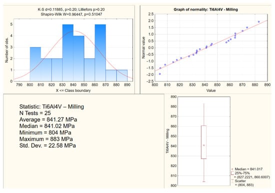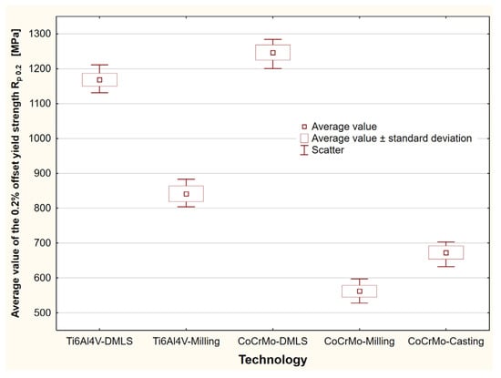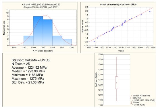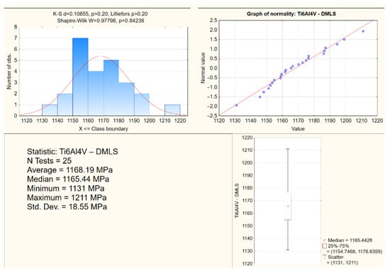The study presents exemplary analyses of the normality distribution of the offset yield strength for the Ti6Al4V alloys from DMLS and from milling (Figure 8 and Figure 9). In the compression tests, the percentage difference in the average values of the strength parameters of the biomaterials from the analyzed technologies in relation to DMLS was also determined (Table 2).