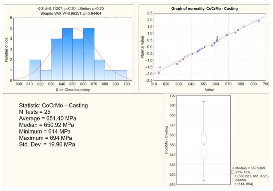 The lowest resistance to deformation was found for CoCrMo from CAD/CAM milling, and the highest resistance to deformation, but with the highest brittleness, from DMLS. Photos of the samples before the tensile test and after their tearing confirmed different percentage deformations depending on the manufacturing technology (Figure 2). Statistical studies of the research results were performed for all samples. The study presents exemplary analyses of the normality distribution of the offset yield strength for the CoCrMo alloys from DMLS and casting (Figure 5 and Figure 6). In the tensile tests, the percentage difference in the average values of the strength parameters of the biomaterials from the analyzed technologies in relation to DMLS was also determined (Table 1).