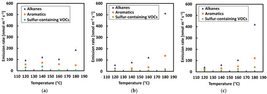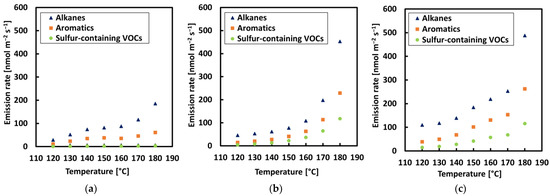 VOC concentration rate of alkanes; aromatics, and sulfur compounds for each sample with a step-by-step increase in temperature: (a) REF, (b) crumb rubber modified bitumen 1 (CRMB1), and (c) CRMB2.